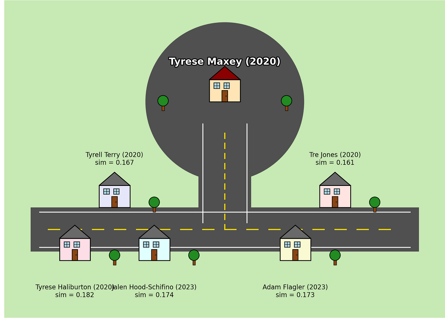 Using the TF-IDF vectors and cosine similarity, I can find the players whose scouting writeups share the most language in common. To give a sense of what this looks like, here is an example with Tyrese Maxey: