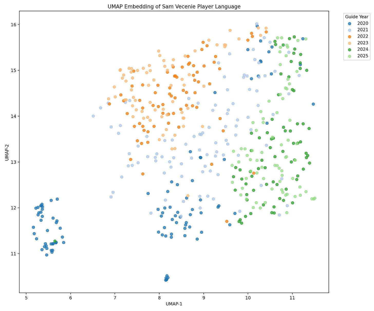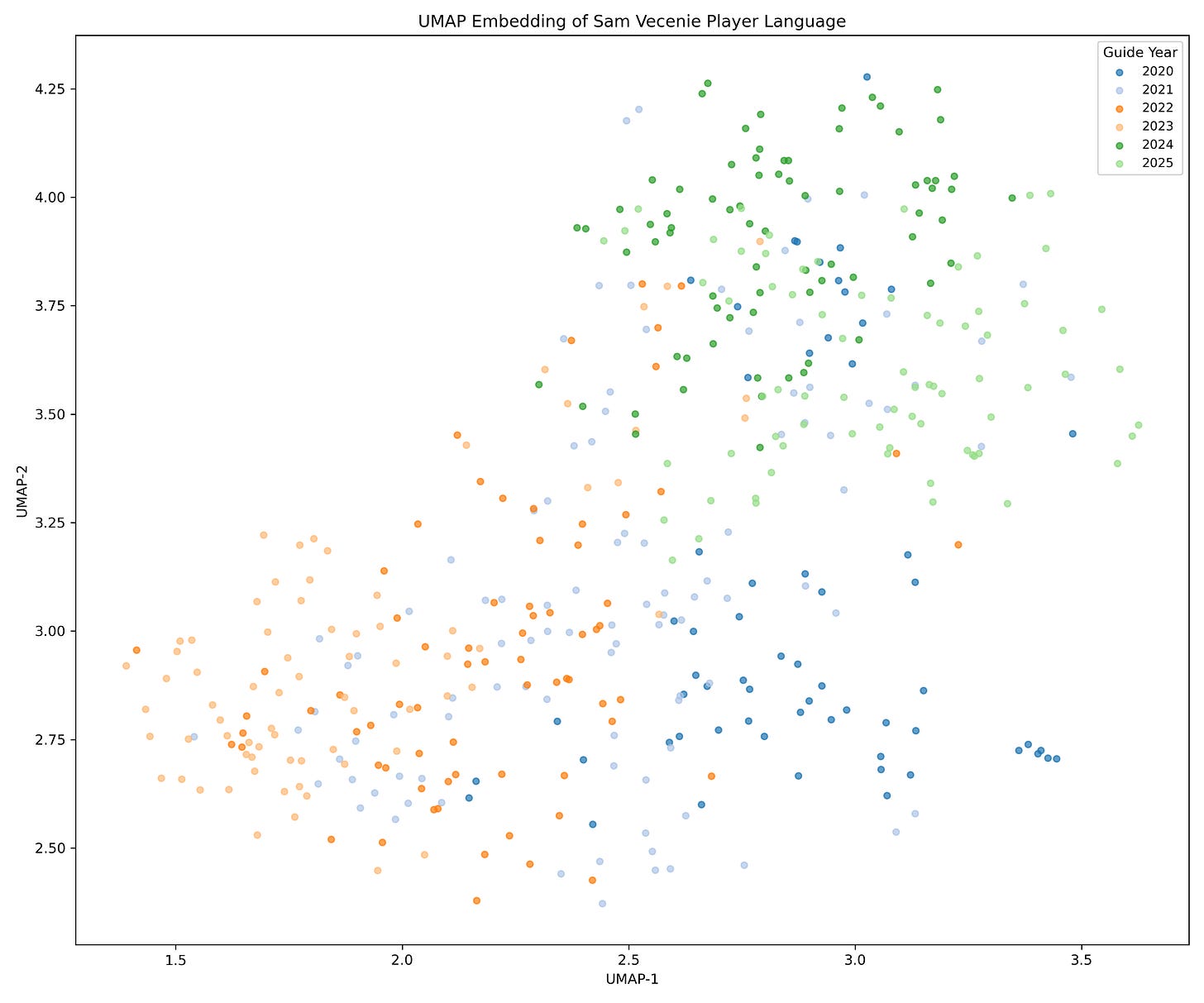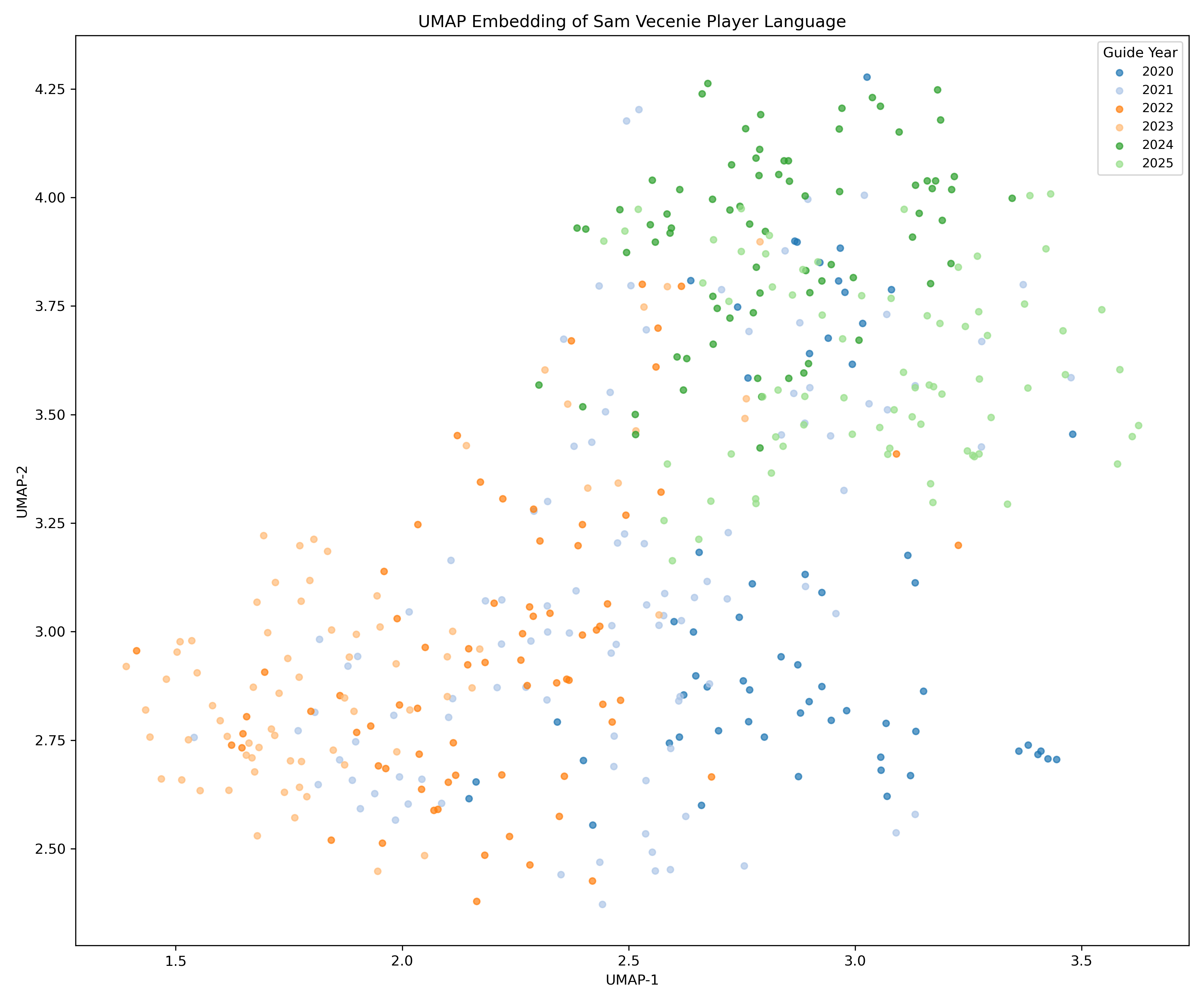 These cross-year relationships ended up being one of the more interesting parts of the project. They highlight players who may have very different contexts or roles but whose writeups share the same language. They also help confirm that the model is picking up some patterns in Sam’s evaluative style rather than just the vocabulary of a single draft guide (I think).