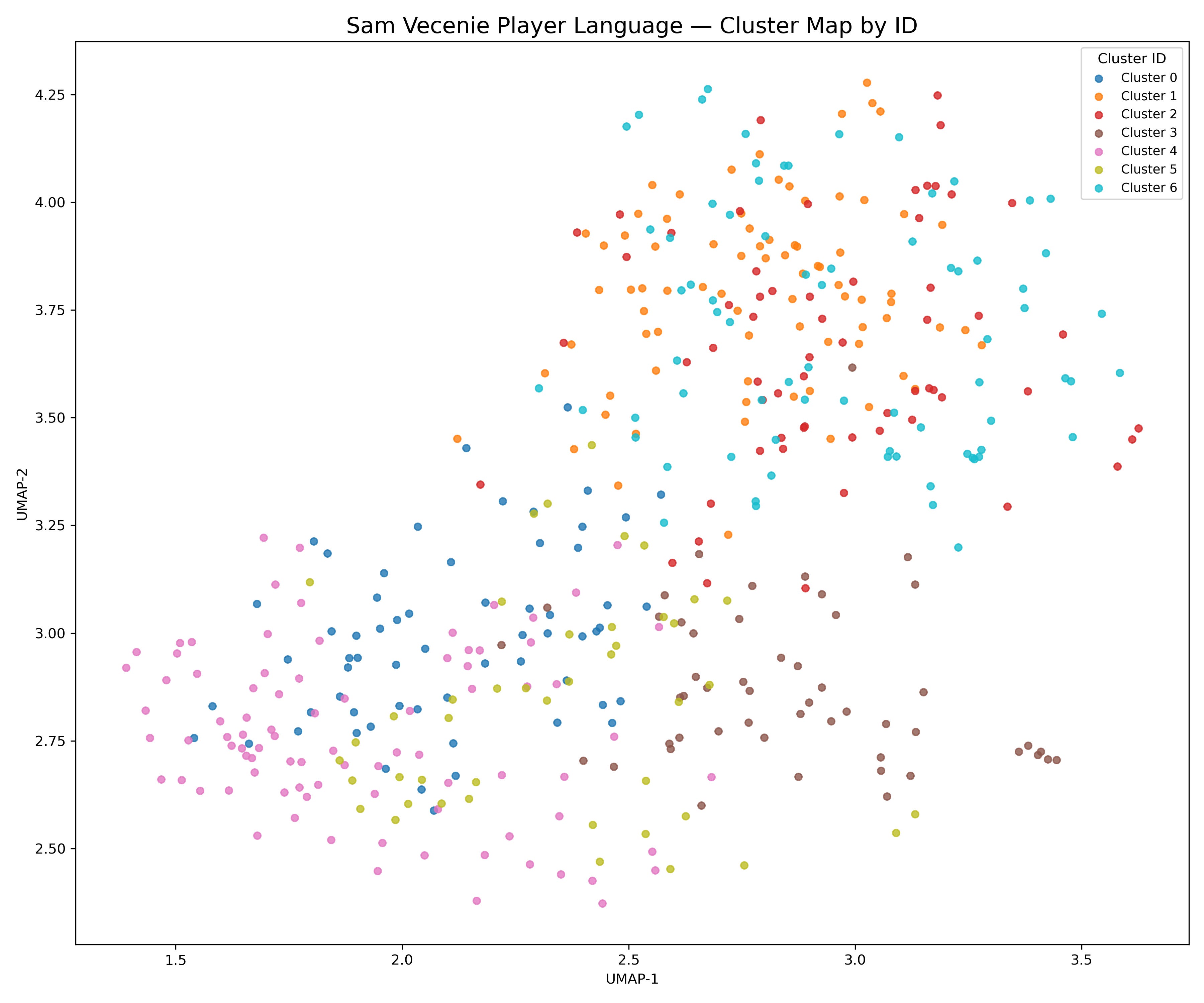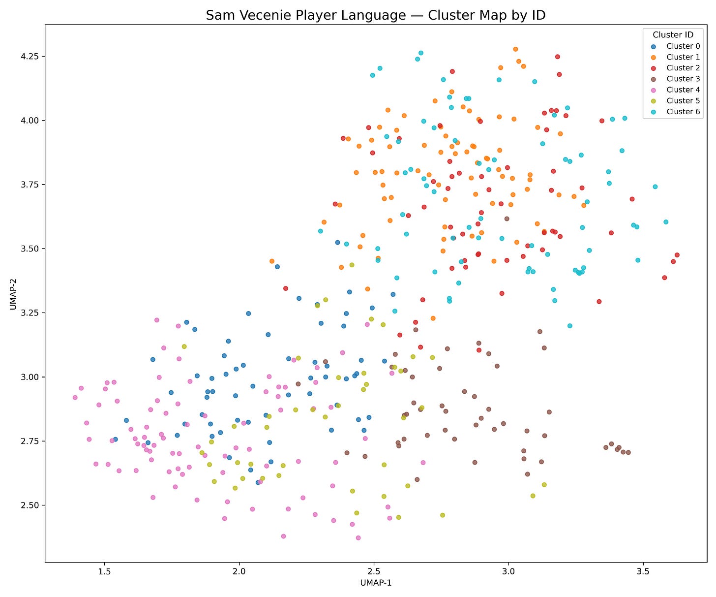 Once the clusters were created and I had a sense of how the language grouped itself, the next question was how to explore the space in a more concrete way. Clusters are helpful, but they are still a bird’s-eye view. I wanted to know what the relationships looked like at the individual player level.