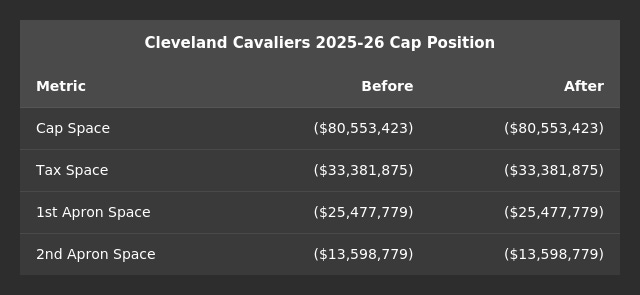 Getting under the Second Apron Level? The Cavs sit just $13.8 million above the Second Apron Level now, with expiring contracts such as Lonzo Ball and Dean Wade on the books. My best guess is that they try to get under this line in the next 24 hours.
