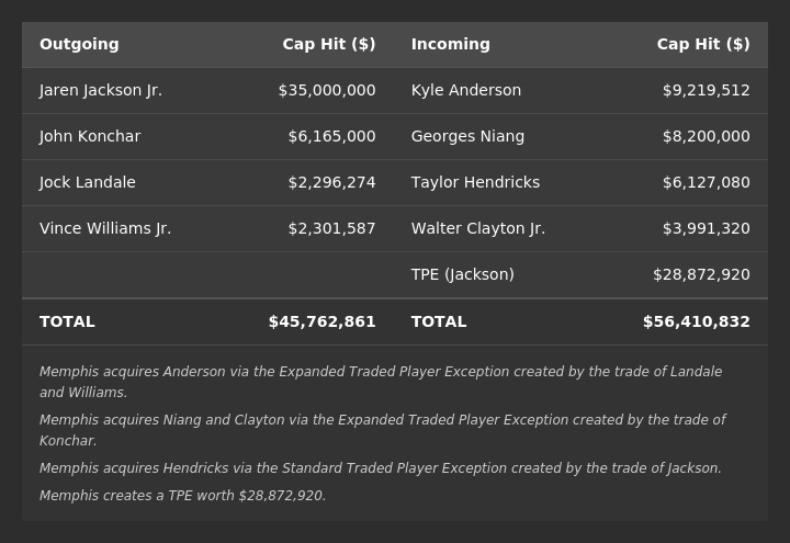 Memphis acquires Taylor Hendricks ($6,127,080) via the Standard Traded Player Exception created by the trade of Jaren Jackson ($35,000,0000). Memphis creates a TPE worth $28,872,920, which will expire one year from the date the trade is finalized with the league office.