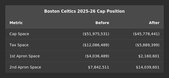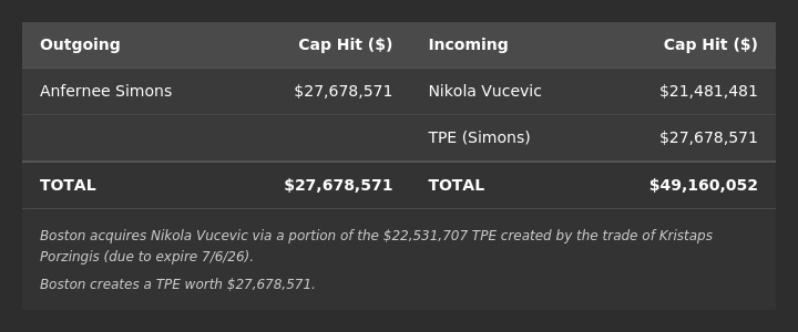 Boston also creates a TPE worth $27,678,571, which will expire one year from the date the trade is finalized with the league office.