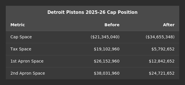 ~$5.8 million in Tax Space. Detroit still has some room to play with as we head toward the deadline. Probably nothing major, but they can still make some margin moves while staying under the Tax (assuming that is a goal of theirs).