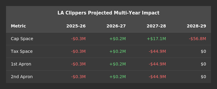 A little less flexibility. With the acquisition of Garland’s contract, the Clippers now have slightly less future financial flexibility. Note, the cap space differential number above includes cap holds and does not project maximum cap space. That said, the Clippers still have as much flexibility as anyone with just Zubac and Garland on the books as guaranteed money in 2027-28.