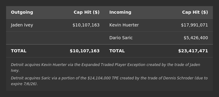 Detroit acquires Kevin Huerter ($17,991,071) via the Expanded Traded Player Exception created by the trade of Jaden Ivey ($10,107,163).