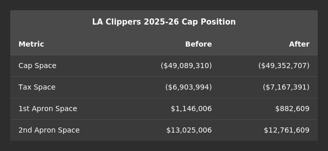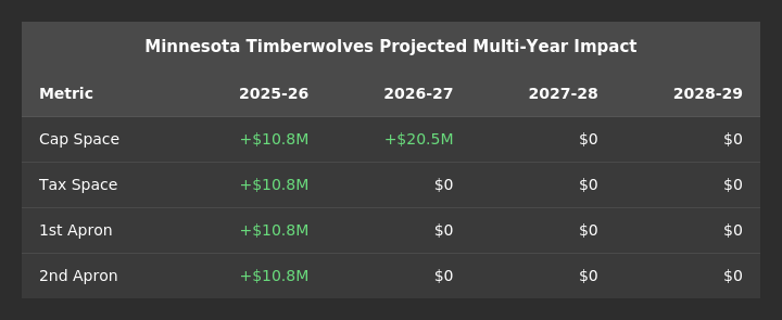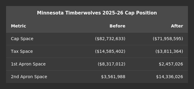 Minnesota got under the First Apron. The Wolves will be about $2.5 million under the First Apron. It’s not a huge buffer, but enough to restore meaningful flexibility. They can absorb a bit more salary in a trade now, and they don't have to worry about creeping toward the Second Apron.