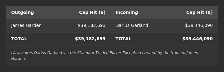 LA acquires Darius Garland ($39,446,090) via the Expanded Traded Player Exception created by the trade of James Harden ($39,182,693).