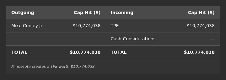 Minnesota sends out Mike Conley ($10,774,038) while taking back just cash considerations, creating a $10,774,038 TPE, which will expire one year from the date the trade is finalized with the league office.