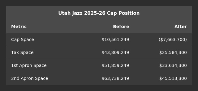 Utah acquires Vince Williams Jr. ($2,301,587) via a portion of the $3,564,000 TPE created by the trade of PJ Tucker (due to expire 2/6/26).