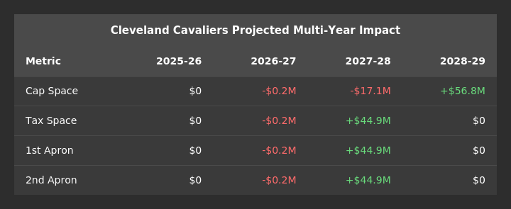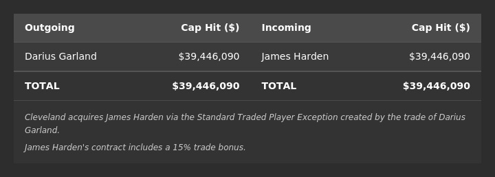 Note: Harden’s contract contains a 15% trade kick, which cannot exceed Darius Garland’s salary for matching purposes (given Cleveland’s position above Second Apron Level). So, we are assuming that Harden will only earn a trade bonus amount equal to the difference in the two players’ salaries.