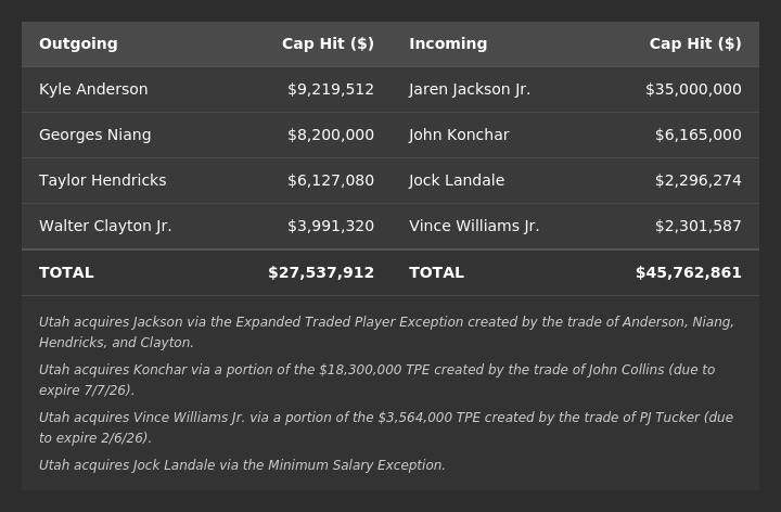 Utah acquires Jaren Jackson Jr. ($35,000,000) via the Expanded Traded Player Exception created by the trade of Kyle Anderson ($9,219,512), Georges Niang ($8,200,000), Taylor Hendricks ($6,127,080), and Walter Clayton Jr. ($3,991,320).
