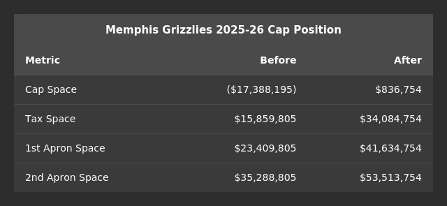 More moves to come. Memphis now has a $34 million in tax space and some moderately sized contracts that they’ll be open to moving. I’d consider just about everyone on this roster available, with the exceptions of Edey, Coward, and maybe Jaylen Wells/Cam Spencer. The biggest names to keep an eye on are, of course, Morant, Caldwell-Pope, Brandon Clarke, and Santi Aldama.