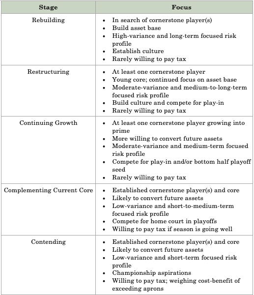 The chart above shows where various starting lineups fit on that spectrum. But that’s just a snapshot. Every NBA franchise moves through periods of growth, stability, and decline. Some cycles last a few years, others stretch across a decade or more. My assumption is that the general pattern tends to repeat.