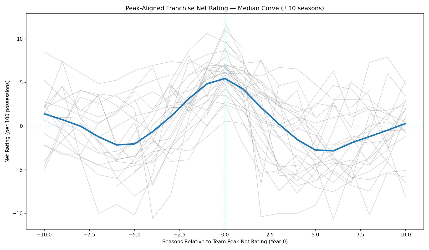 Because every team’s rise and fall occur on a different timeline, the individual charts can be hard to compare directly. To look for a shared pattern, I re-centered each franchise’s history around the season in which it recorded its peak net rating. The chart below shows the median curve across all teams, spanning the ten seasons before and after each franchise’s peak year.