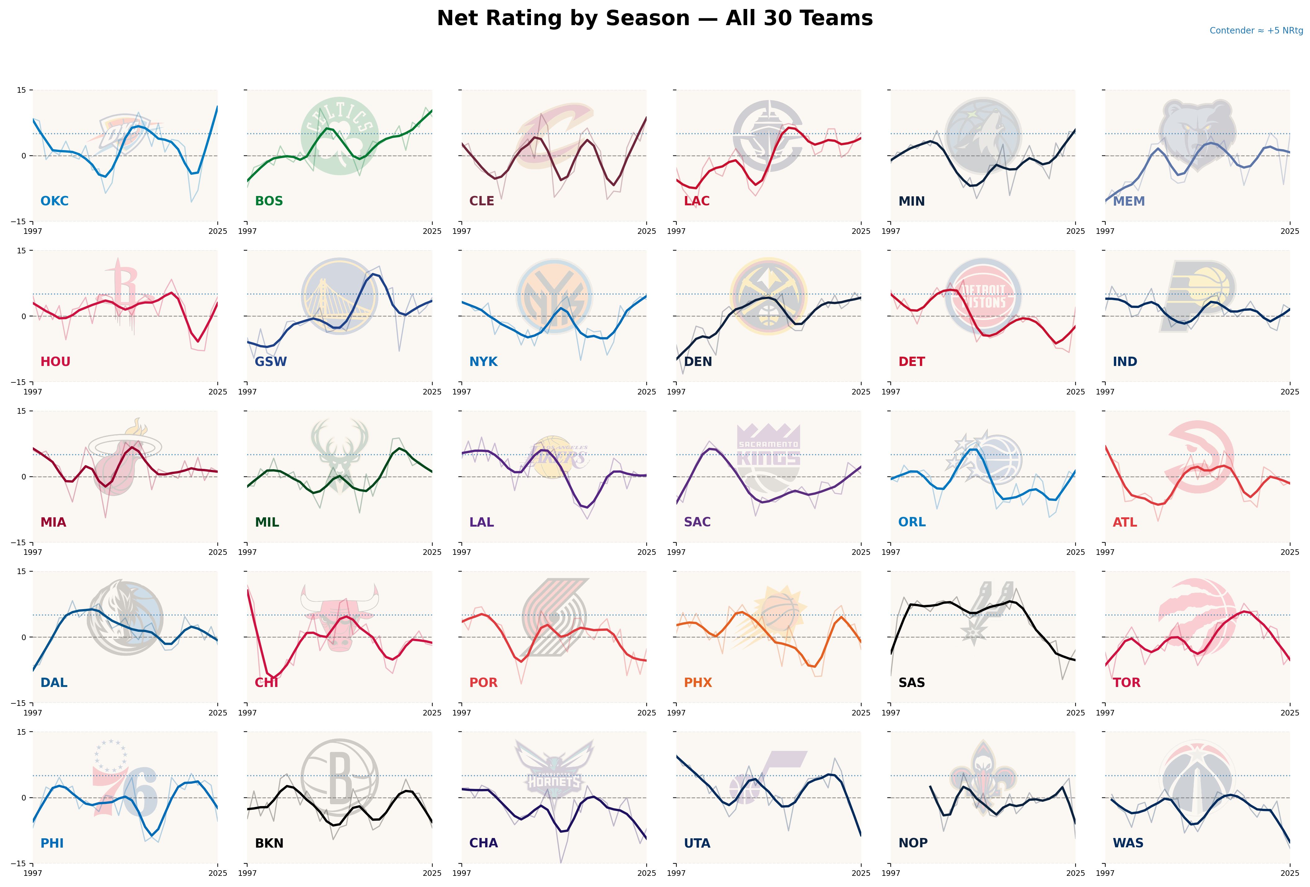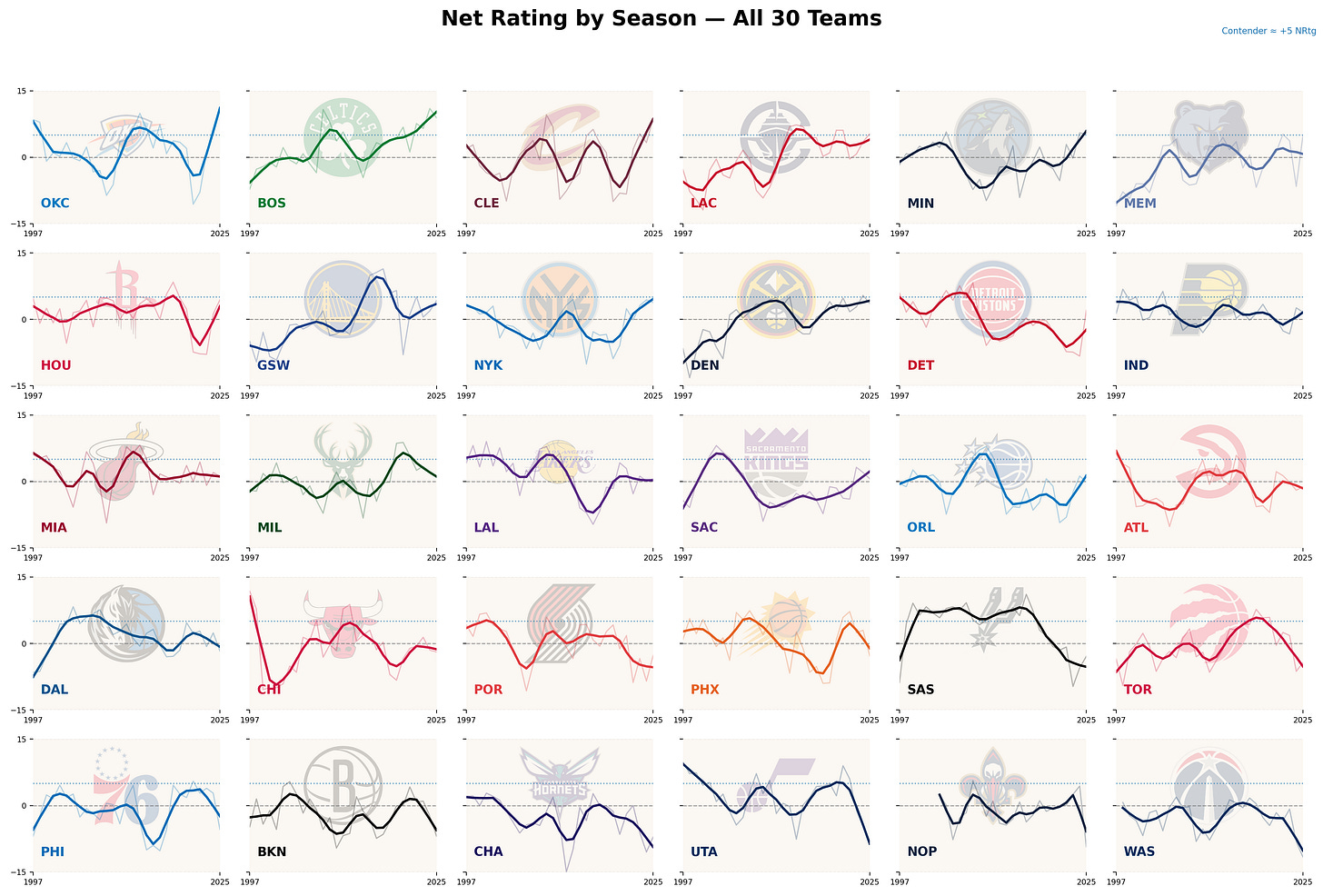 Each panel shows a single franchise’s net rating history from 1997 through 2025. To emphasize long-term trends rather than year-to-year volatility, I applied a locally weighted smoothing function to each team’s data (this helps capture the general shape of each franchise’s trajectory without letting individual outlier seasons dominate the line).